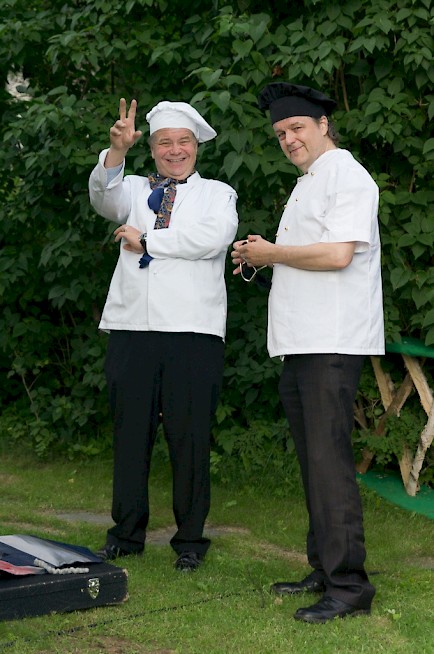 Yleisö luulee kokkeja juhlan henkilökuntaan kuuluviksi.