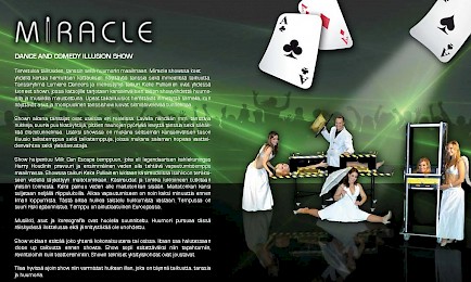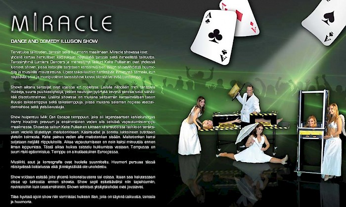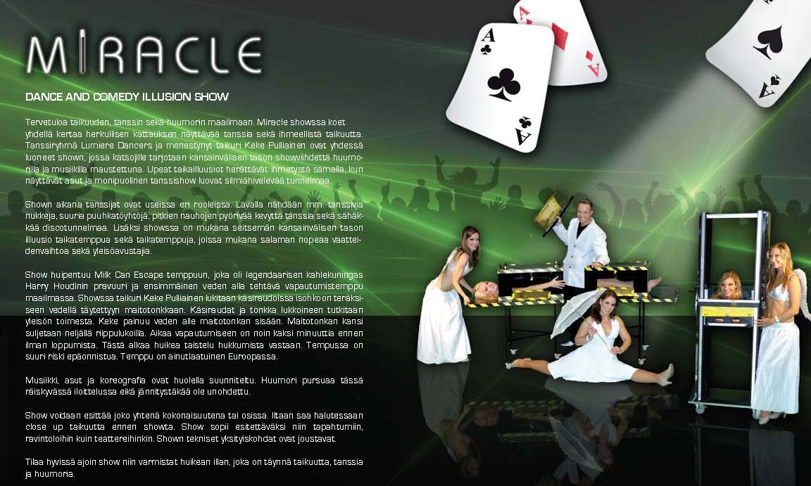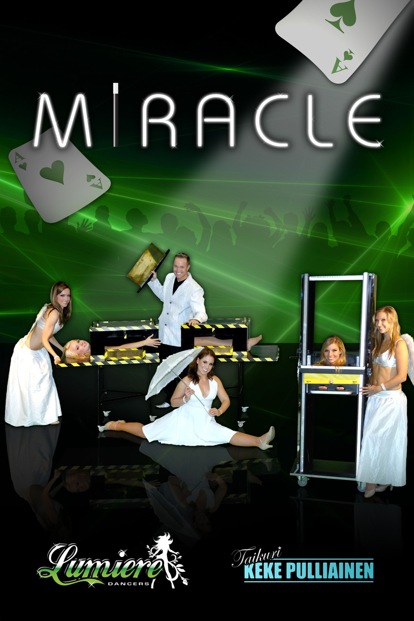 Tervetuloa taikuuden, tanssin sekä huumorin maailmaan. Miracle showssa koet yhdellä kertaa herkullisen kattauksen näyttävää tanssia sekä ihmeellistä taikuutta. Tanssiryhmä Lumiere Dancers ja menestynyt taikuri Keke Pulliainen ovat yhdessä luoneet shown, jossa katsojille tarjotaan kansainvälisen tason showviihdettä huumorilla ja musiikilla maustettuna. upeat taikailluusiot herättävät ihmetystä samalla, kun näyttävät asut ja monipuolinen tanssishow luovat silmiähivelevää tunnelmaa.