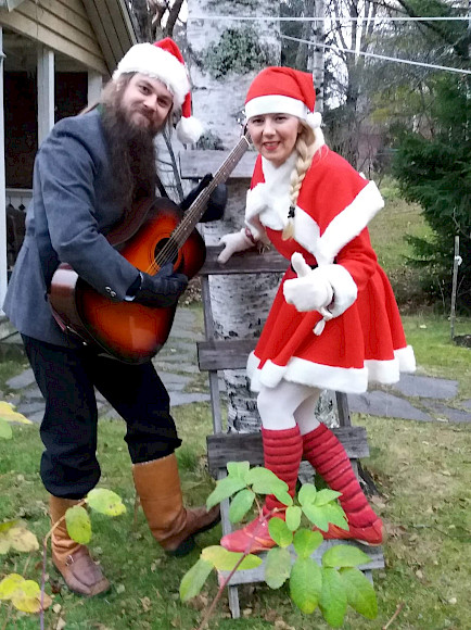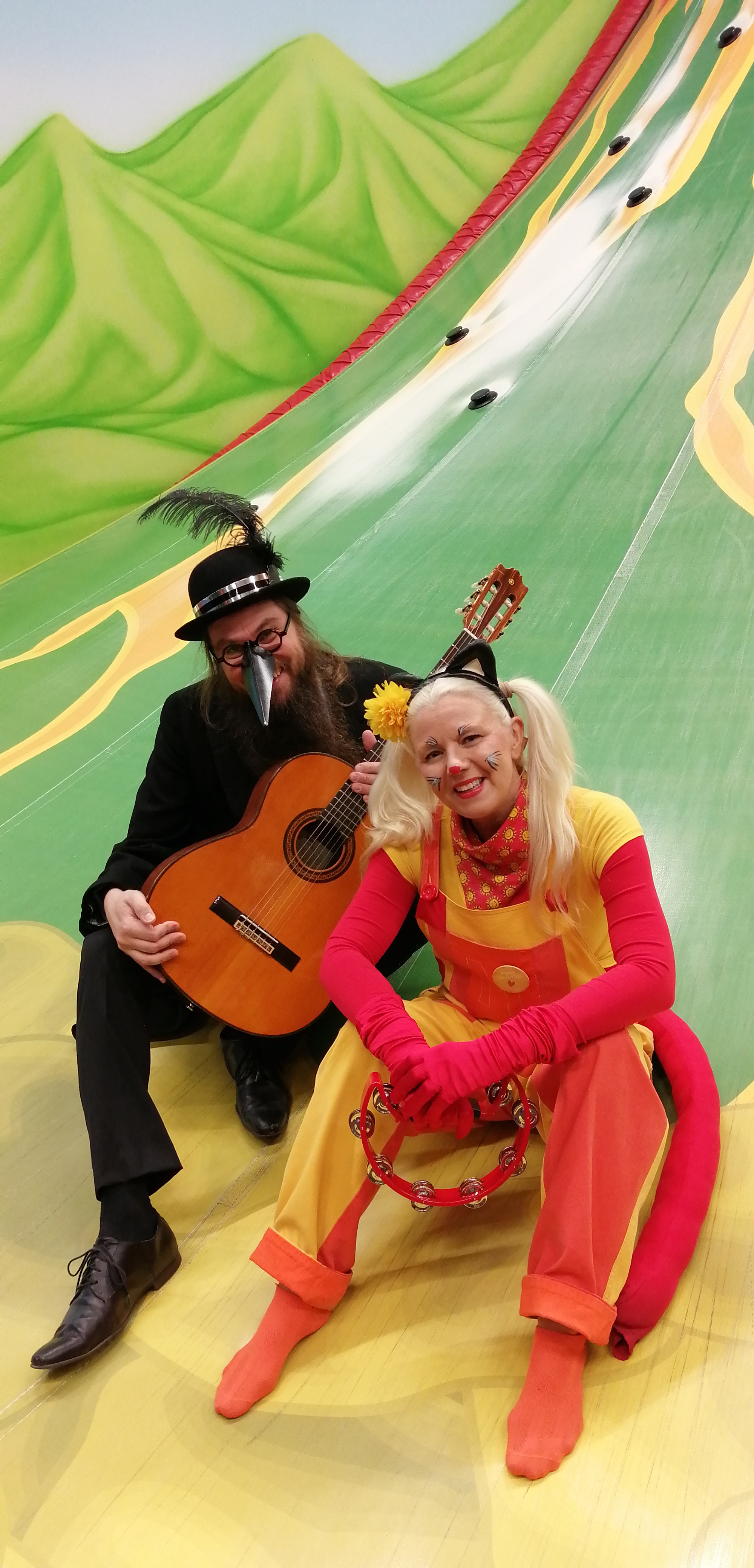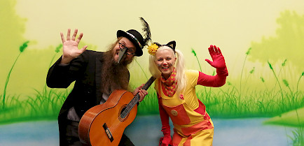 Minttu-Kissa leikittää lapsia ja Pietari Varis säestää laulut kitaralla.